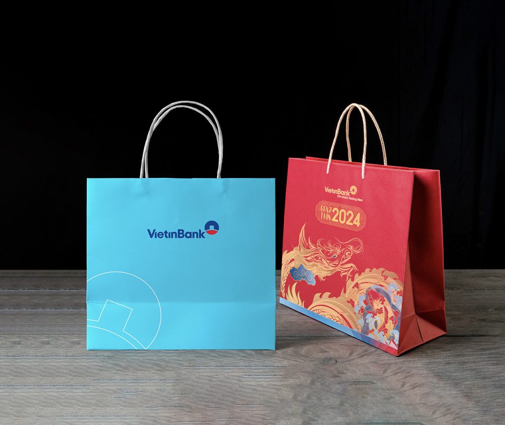 - In ấn đặc biệt: Túi quà VietinBank với màu xanh thương hiệu và túi Tết Giáp Thìn 2024 màu đỏ rực rỡ, sử dụng họa tiết truyền thống in ấn nổi bật, khẳng định thông điệp và vị thế của doanh nghiệp.
