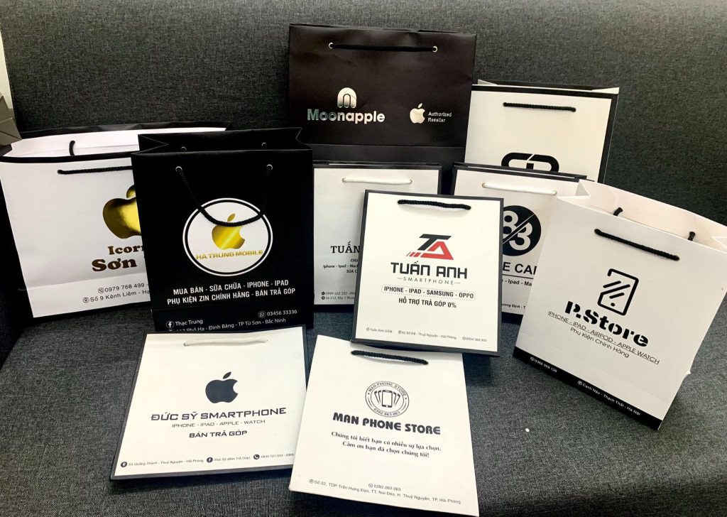 - Túi Đựng Điện thoại & Phụ kiện: Các mẫu túi đen/trắng đơn giản nhưng sắc nét cho các cửa hàng như Moonapple, Icon Sơn, Tuấn Anh, tập trung làm nổi bật logo thương hiệu.