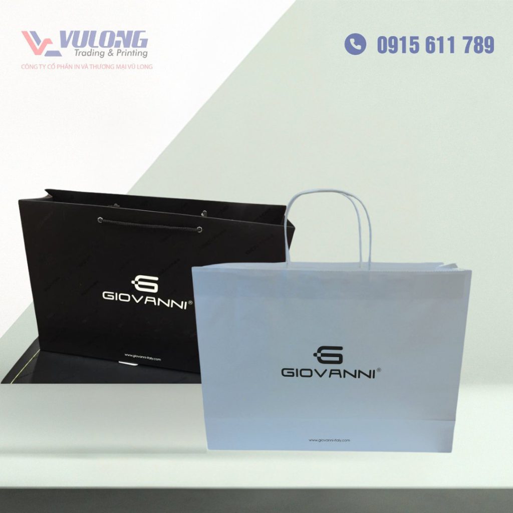 - Gia công tinh xảo: Dây quai lụa, dây dù xoắn, hay dây giấy cao cấp, cùng với kỹ thuật in logo, ép kim, dập nổi để tạo điểm nhấn thương hiệu. ( K.NGUYEN H&M Authentic và GIOVANNI).