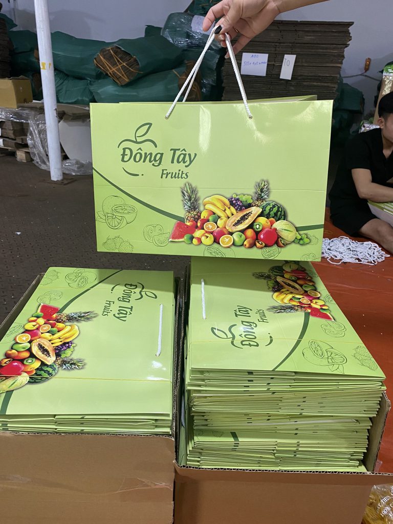 - Trái cây tươi: Túi đựng Đông Tây Fruits màu xanh lá nổi bật, hình ảnh minh họa sống động, chắc chắn, phù hợp làm túi đựng quà biếu.