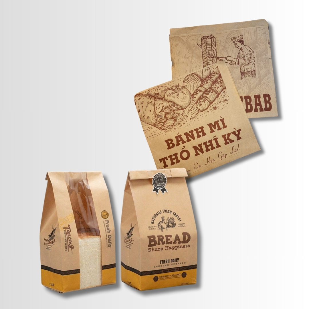 Bánh Mì/Bánh Ngọt: Túi giấy Kraft có cửa sổ hoặc hộp đựng bánh mì, với thiết kế vintage (như các mẫu túi đựng bánh mì Thổ Nhĩ Kỳ) hoặc hiện đại, đảm bảo vệ sinh và giữ được độ tươi ngon.