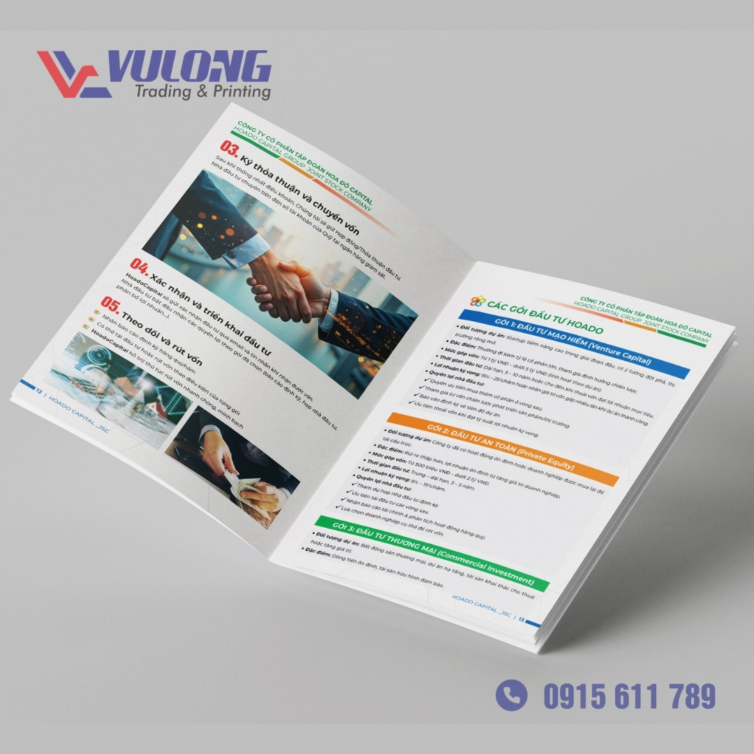 Tư vấn Kỹ thuật: Đề xuất giải pháp tối ưu về chất liệu giấy (ví dụ: Couche 250-300gsm cho bìa, Couche 150gsm cho ruột, hoặc giấy mỹ thuật), kích thước chuẩn (thường là A4 đứng/ngang, hoặc khổ vuông), và công nghệ in (in Offset cho số lượng lớn, in Kỹ thuật số cho số lượng ít/in nhanh).