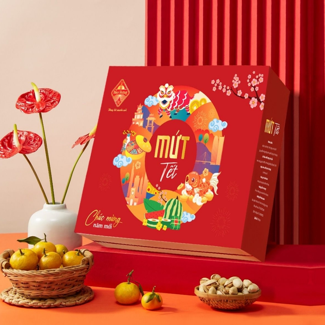 - Hộp Mứt Tết với hình ảnh minh họa sinh động, vui tươi.