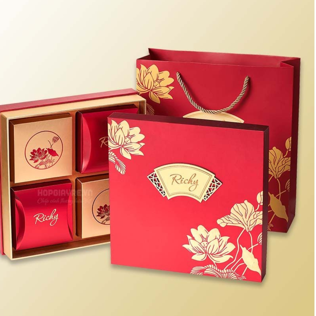 Tính Thẩm Mỹ và Văn Hóa: Các mẫu hộp quà Tết thường sử dụng màu sắc chủ đạo là Đỏ và Vàng kim – tượng trưng cho sự may mắn, tài lộc và sung túc.