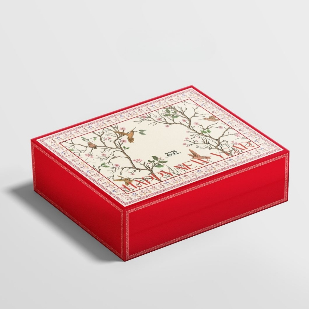 - Hoa Mai/Hoa Đào: Biểu tượng mùa Xuân trên các mẫu hộp sang trọng, đặc biệt là tông Vàng kim mang lại không khí Tết rực rỡ.