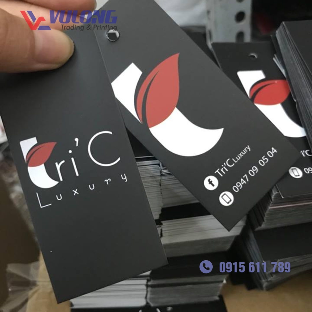 Thẻ Treo (Hang tag/Price tag): Đa dạng kiểu dáng từ vuông, chữ nhật đến bế hình đặc biệt, in trên giấy C300, Kraft hoặc giấy mỹ thuật dày dặn (như mẫu thẻ Tri’C Luxury hay Khế Store).